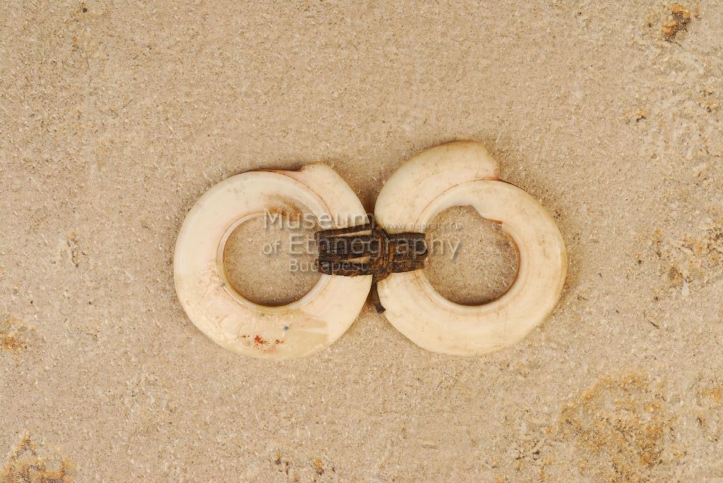 Két, középen barna zsinórral egymás mellé kötözött, fehéres szinü Conus karikából készített disz. Bíró-jegyzet: 560–lehet jabo
