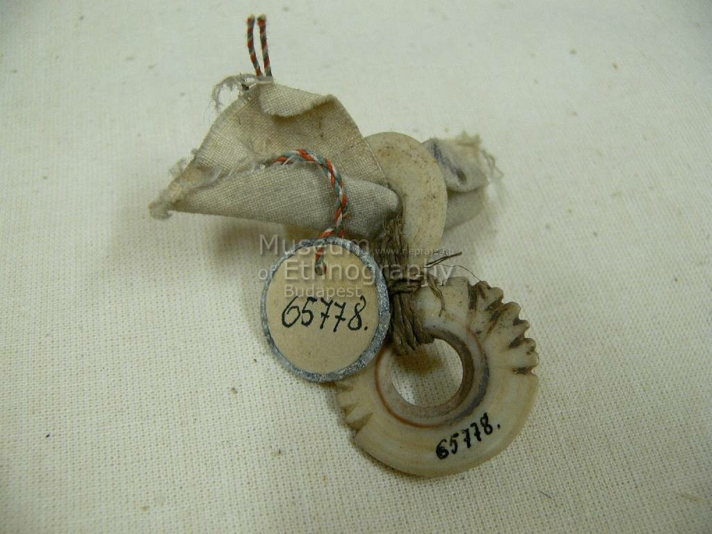 Két középen piros színű hánccsal egymás mellé kötözött, fehéres színű, az egyik peremén cakkozott Conus karikából készített disz. Bíró-jegyzet: 560
