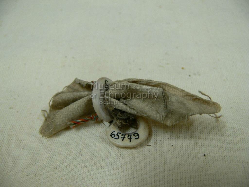 Két középen piros színű hánccsal egymás mellé kötözött, fehéres színű, az egyik peremén cakkozott Conus karikából készített disz. Bíró-jegyzet: 561