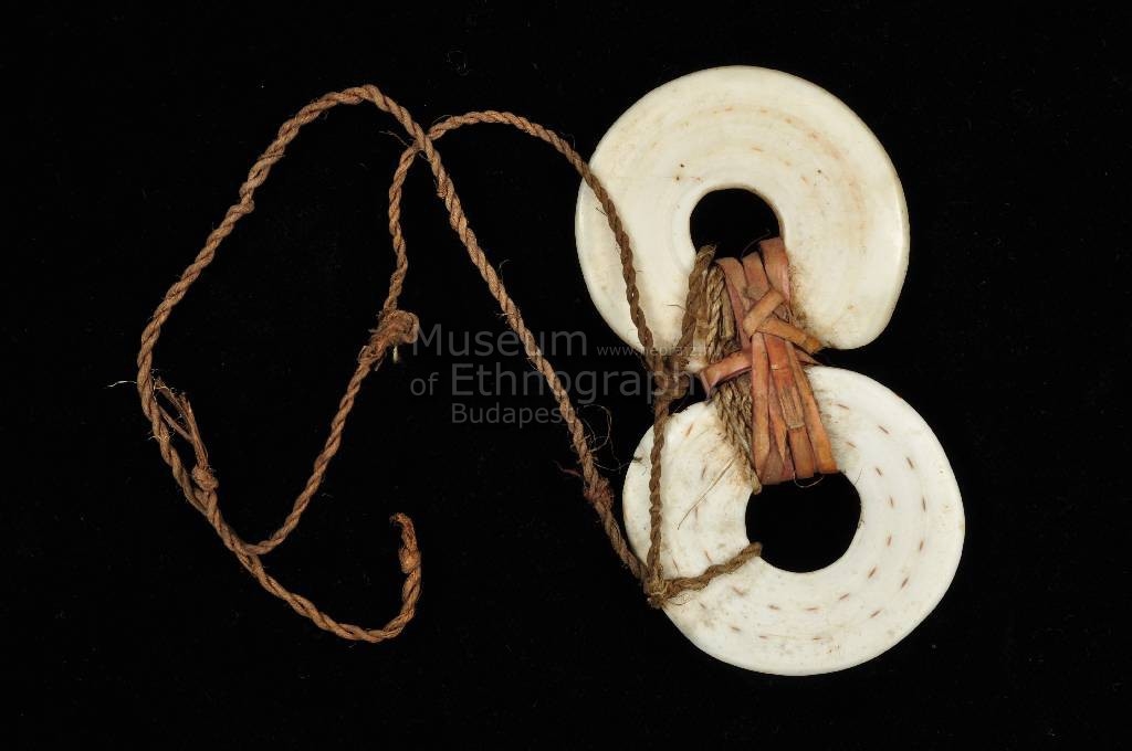 Két, középen piros színű hánccsal egymás mellé kötözött, fehéres színű, az egyik peremén cakkozott Conus karikából készített disz. Bíró-jegyzet: 563