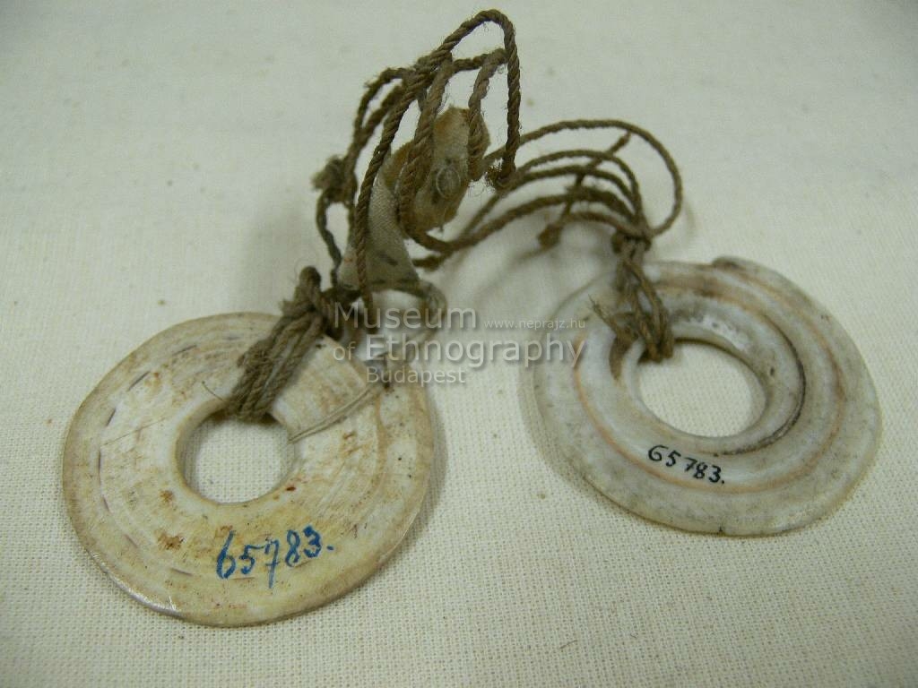 Vékony, fonott zsinegre kötött két fehéres Conuskarikából álló disz. Bíró-jegyzet: 560
