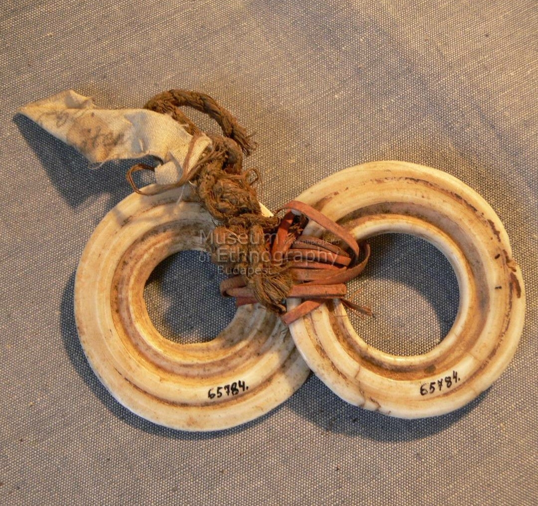 Két, középen piros színű hánccsal egymás mellé kötözött, fehéres színű, az egyik peremén cakkozott Conus karikából készített disz. Bíró-jegyzet: 560 kimaten