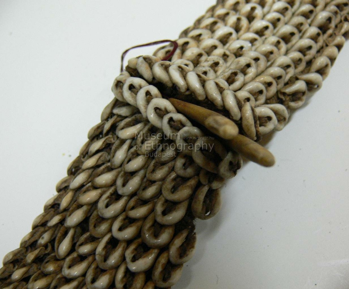 Hosszukás téglalap alakú dísz, egymásmellé kötött hánccsikokból áll. Kauricsigasorok vannak rávarrav, középen függőlegesen is fut két sor, ezek közt kutyafogak vannak.