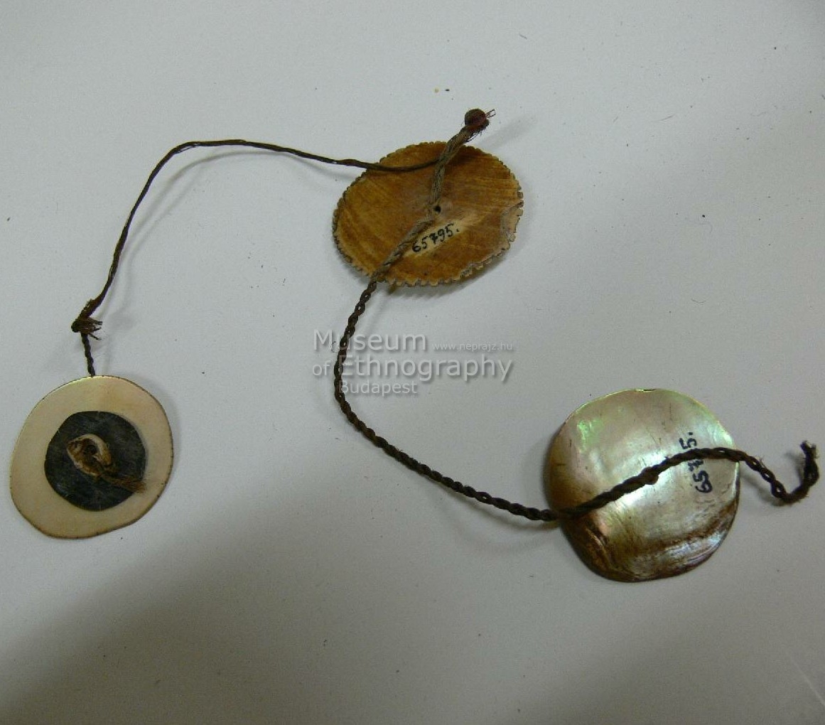 Három darab korong zsinórral összefűzve. Mindegyik egy nagyobb kagylókorongból, egy csipkézett szélű teknőshéjkorongból, legfelül pedig Nassa-csigából áll, amelyek egymás fölé vannak helyezve, és középen átfúrva, ezen keresztül zsinór fogja össze. Az egyiken a középső részt sárgarézlap helyettesíti. Bíró-jegyzet: 603
