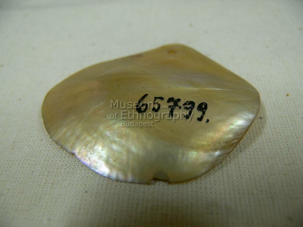 Gyöngyházszínű, egy helyen átfúrt gyöngykagylóhéj. Bíró-jegyzet: 641