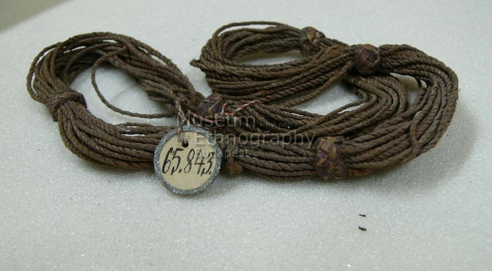 Hosszú, sodrott, körbetekert fonal. Több helyen kéreggyűrű vagy piros fonott faháncsgyűrű fogja össze.