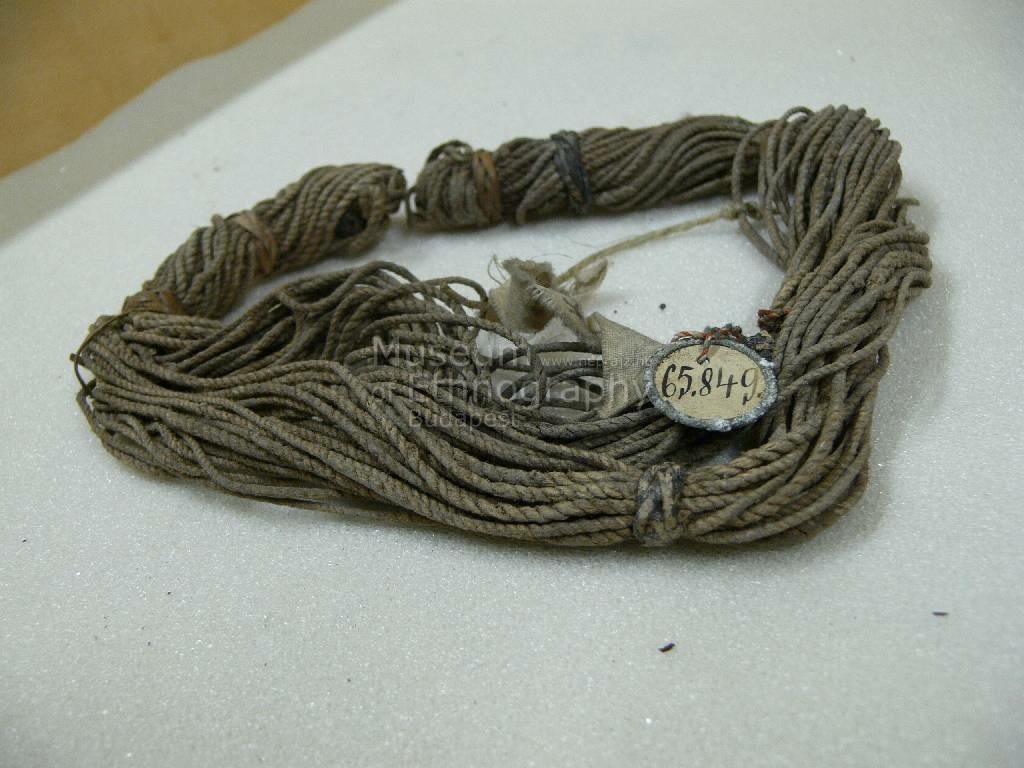 Hosszú, sodrott, körbetekert fonal. Több helyen kéreggyűrű vagy piros fonott faháncsgyűrű fogja össze.