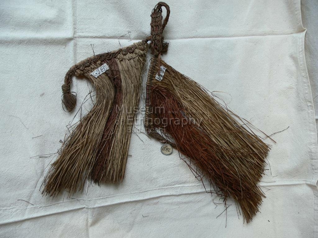 Pandaus-levélből készült szoknya. Derekát ugyanilyen rostfonat képezi, amelyet két oldalt a csipőn nem fed semmi. Egyik csipőn hosszabb szálak segítségével lehet megkötni. Elől és hátul, eltérő hosszúságban, sűrűn egymásmellé kötözött, Pandaus-levélhasitékok lógnak le róla, amelyek a derékon alul már nincsenek egymáshozrögzítve. Derekán oldalt és a szoknya első részén pirosra festett szágólevél adja a díszítést.