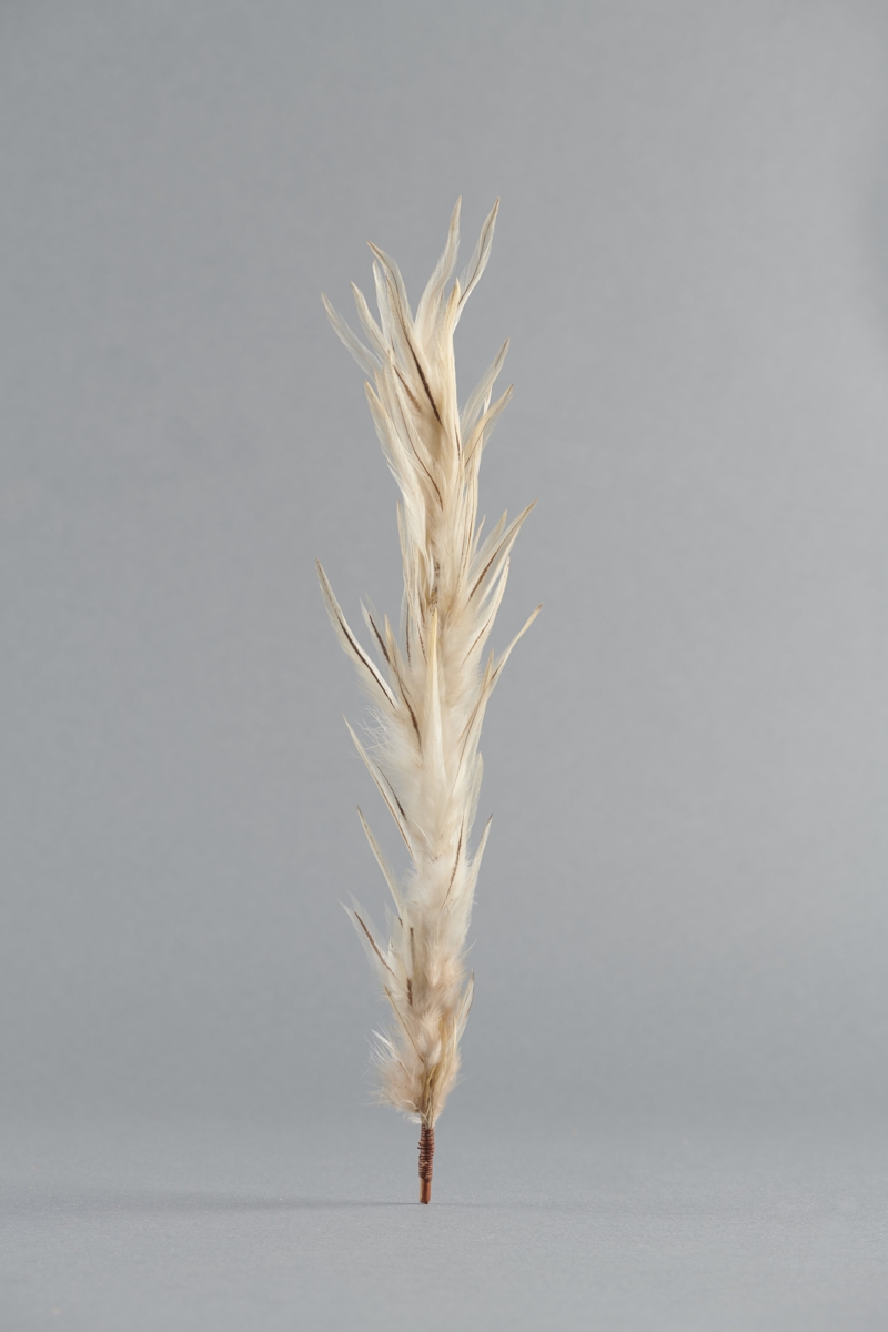Keskeny pálcára erősített fehér kakadútollak.