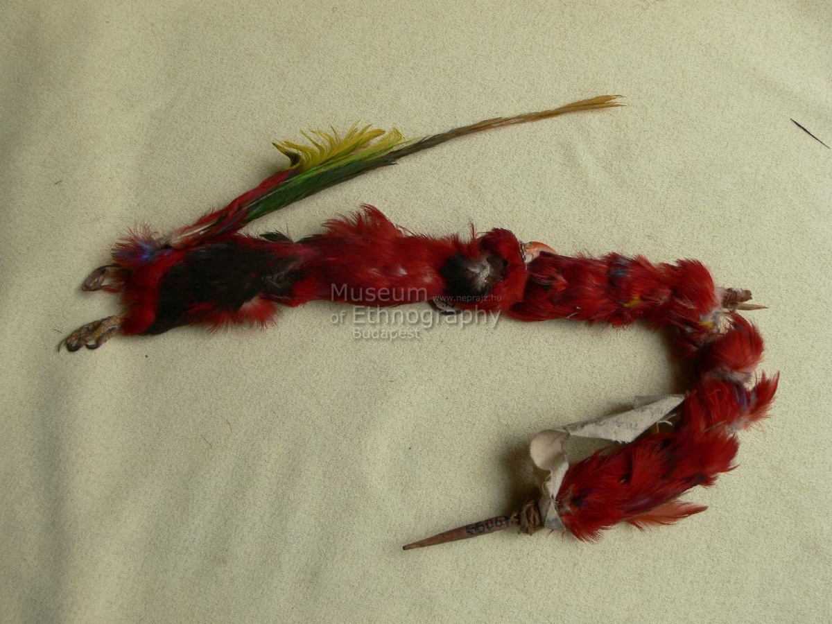 Két hosszu fadarab egymáshozkapcsolva, amelyeket apró piros tollak boritanak. Egyik végén a pálca vége lóg ki, a másikon 2 madárláb és ennek zöldes farktolla. Középen pedig a madár feje. Textilcsikon ráirva: 522 A) titiuo má máni, Bukaua (Agabujdun)