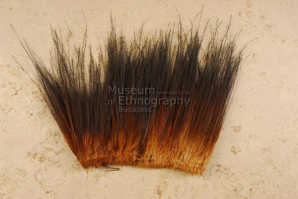 Egymás mellé fektetett fekete kazuártollak, alul zsinórral összekötve, kötöző zsinórral. Bíró jegyzet: Sattelberg 543 a