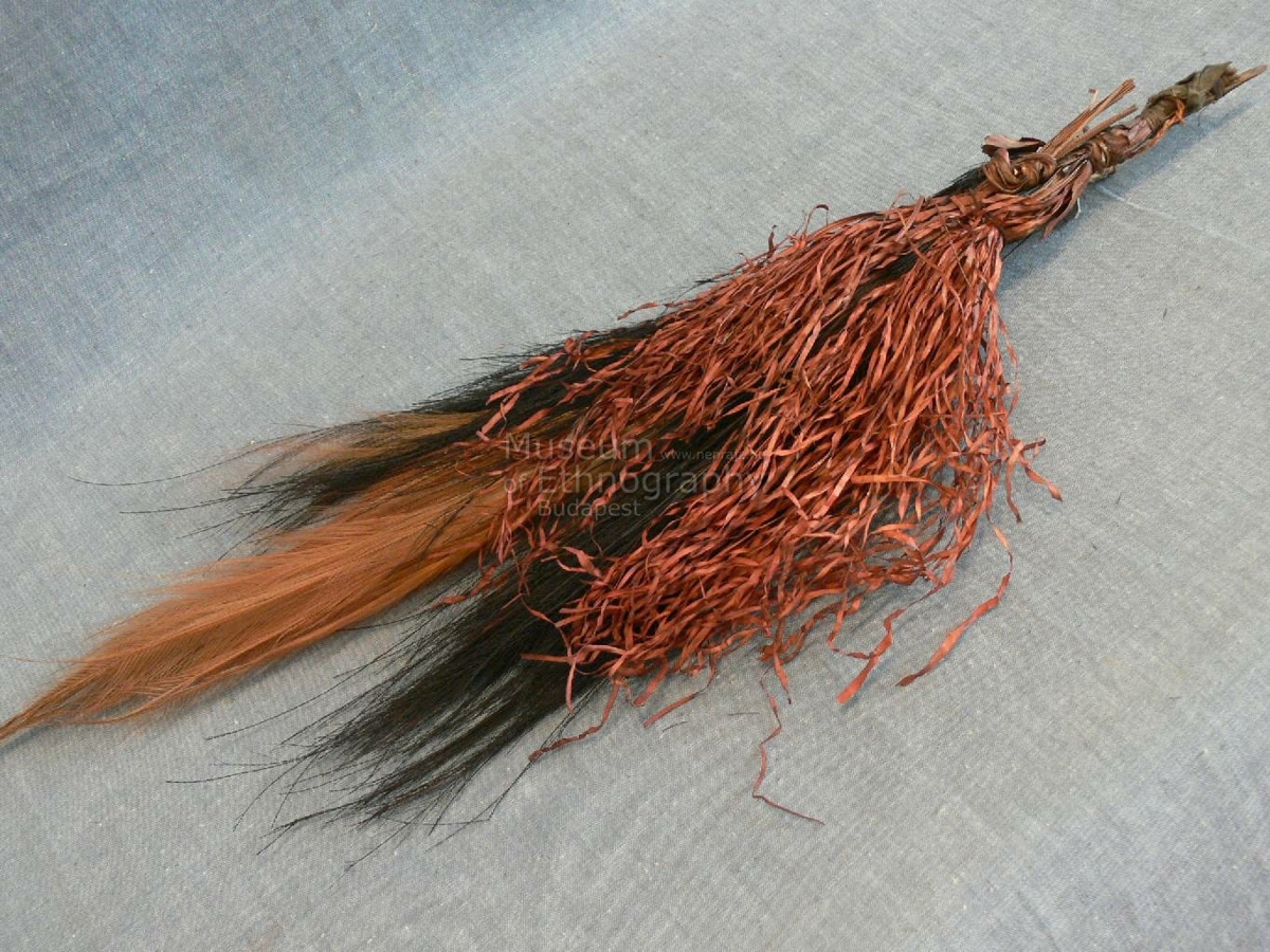Fapálcára erősített madártollcsokor. Középen narancssárga, körben fekete kazuártollakból áll, egyik oldalán pirosra festett hullámos növényi háncs szalagokból álló csokor egészíti ki. A fadarabot növényi rostokkal tekerték körbe, ráerősítve Bíró jegyzet száma: 543/e