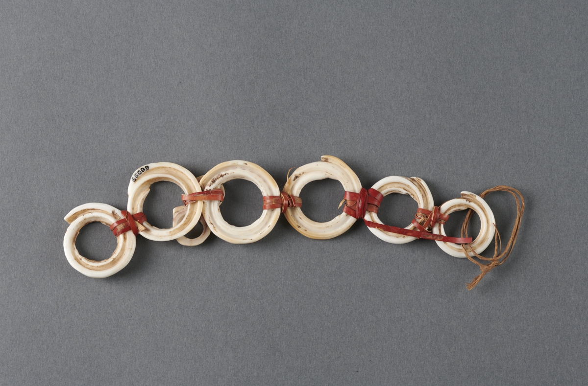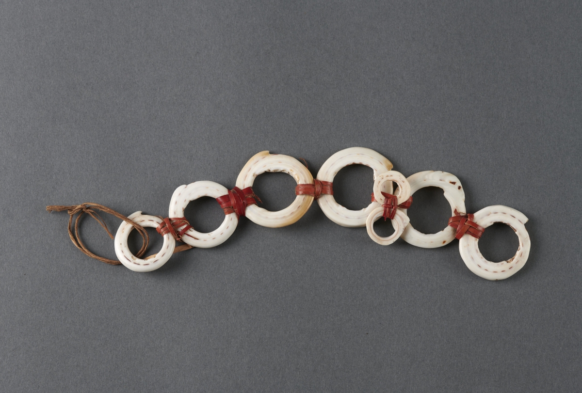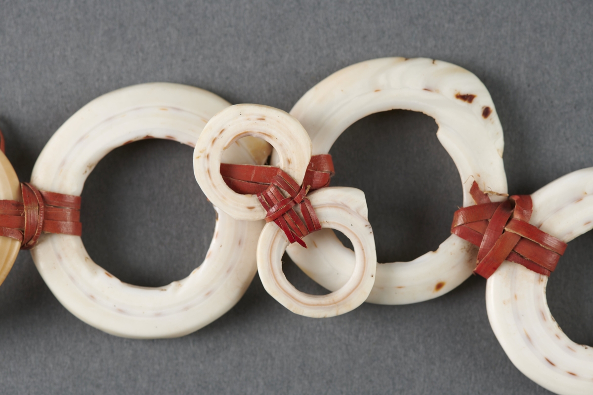 Hat darab conus csiga karika egymás mellé kötve vörös növényi hánccsal. Egyik harmadában két kisebb karika van egymás mellé kötve.