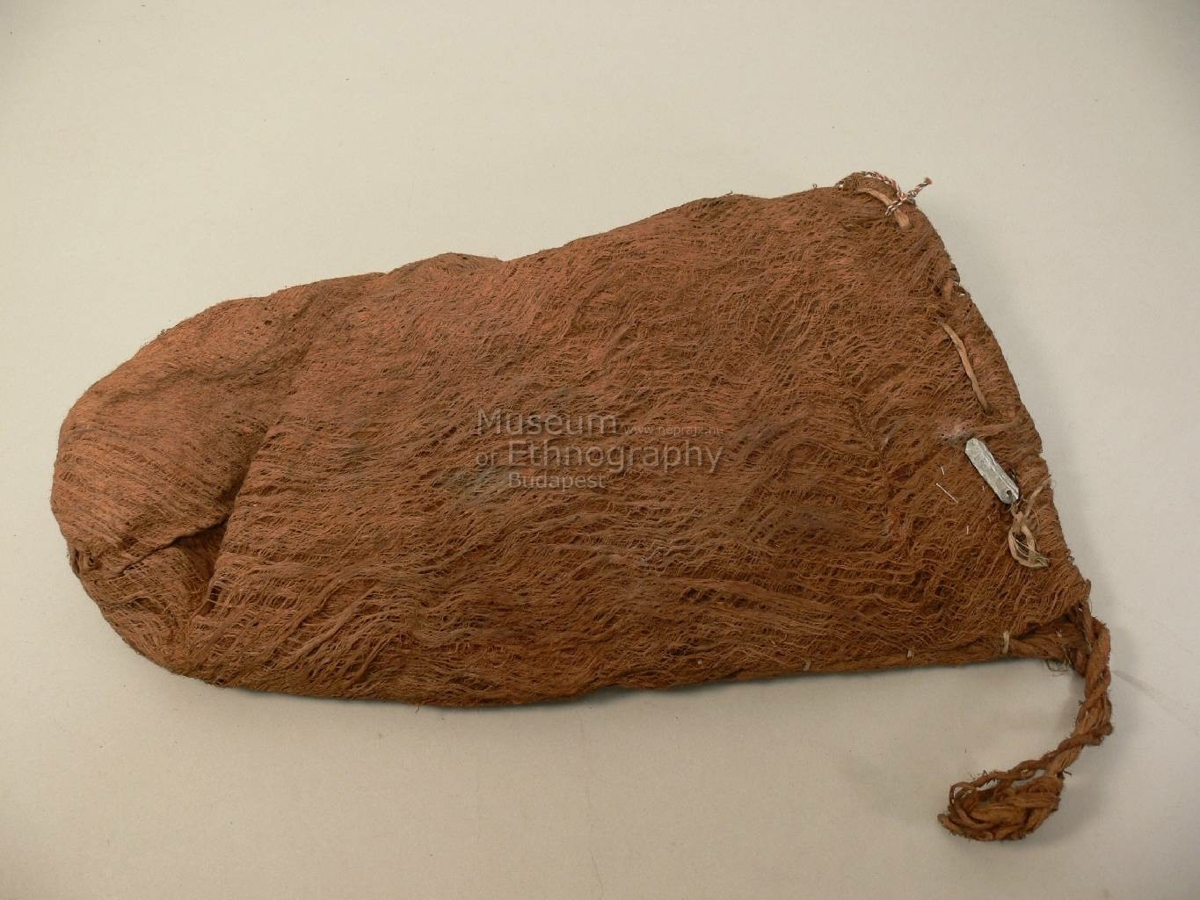 Egy darab tapából készült, zacskóformájú süveg, oldalvarrással. Peremét sodrott tapakötél szegélyezi, a süveg anyagába beágyazva. Az oldalvarrásnál kinyúlik és csomóban végződik. A peremet nagy öltésekkel felvarrt háncsszalag szegélyezi. Bíró-jegyzet 523?