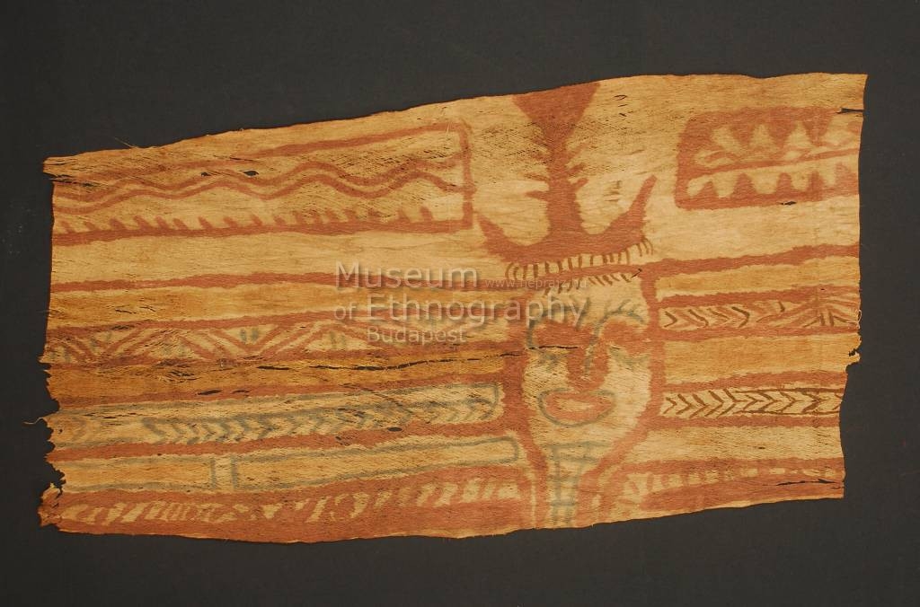 Papíreperfa kérgébôl készült, téglalap alakú tapa, amelyet színes minták borítanak. Fô motívuma egy arc az oabalan