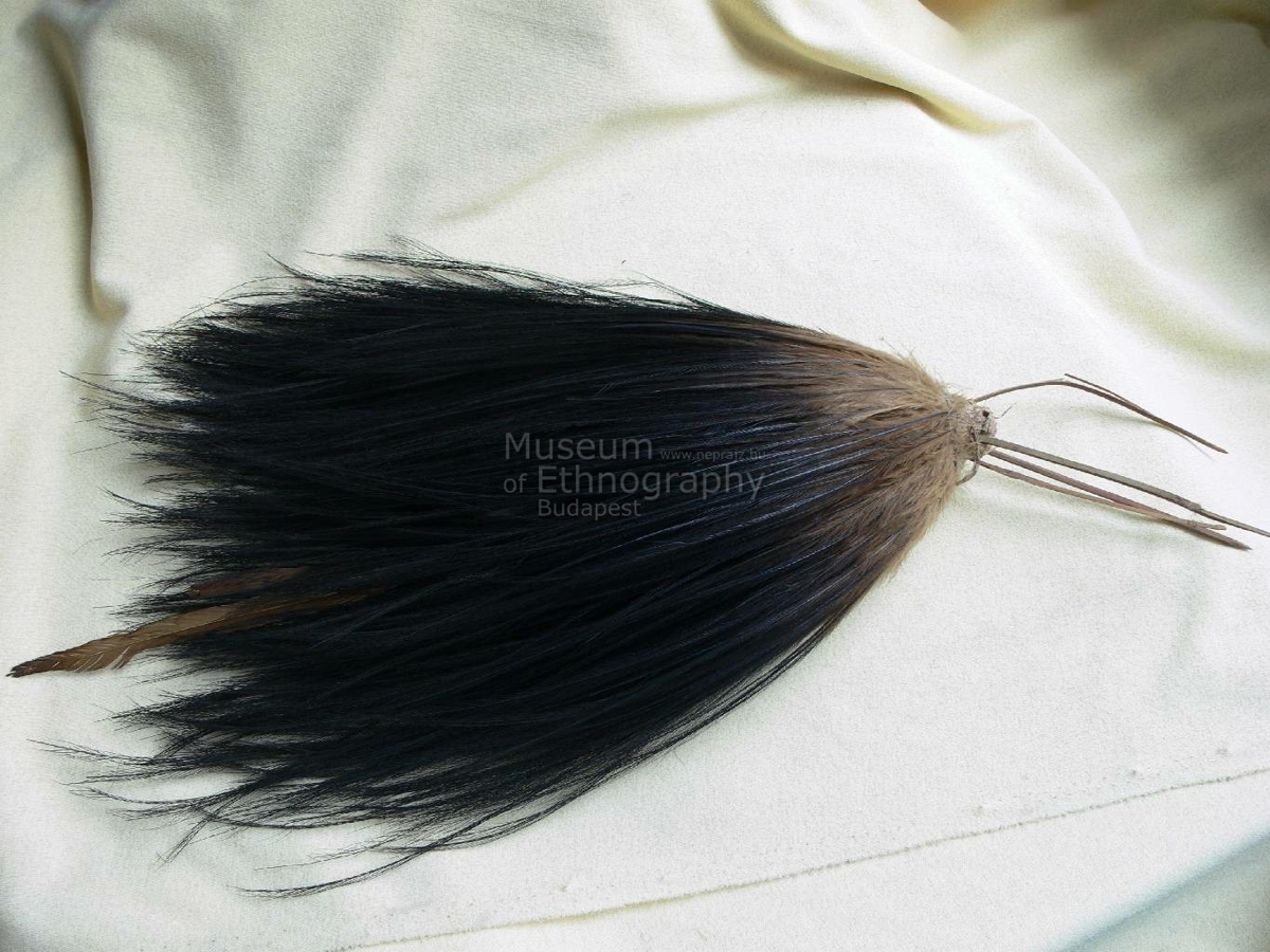 Puhafára erősített fekete kazuártolldísz, középen barna tollal. A fogójába négy spanyolnád van beszúrva.