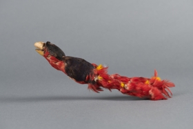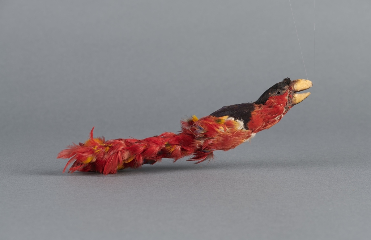 Fekete piros papagájtest, farka helyére két pálca van tűzve, a lábbakkal párhuzamosam, amelyekre apró piros tollak vannak ragasztva.