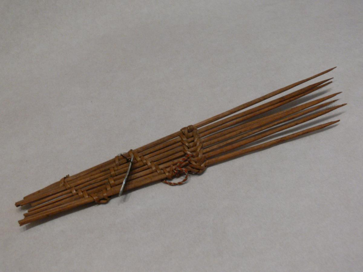 Nyolc darab vékony, egyik végén hegyes, világos színű, fapálcikákból álló téglalap alakú tárgy. A pálcikák kereszt- és átlósirányban húzódó világos színű rostfonadék fűzi össze.