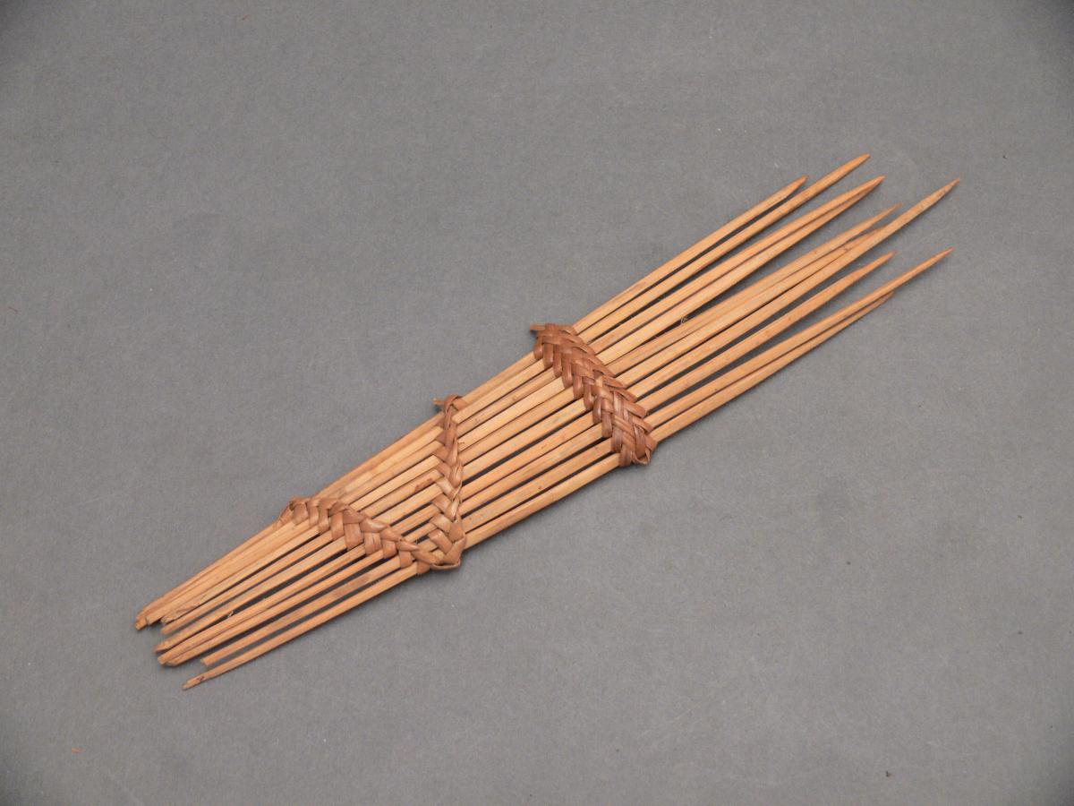 Tíz darab vékony, egyik végén kihegyezett, világos színű fapálcikából áll, hosszúkás téglalap alakú tárgy, a pálcikákat barnás színű rostfonadék fűzi össze.