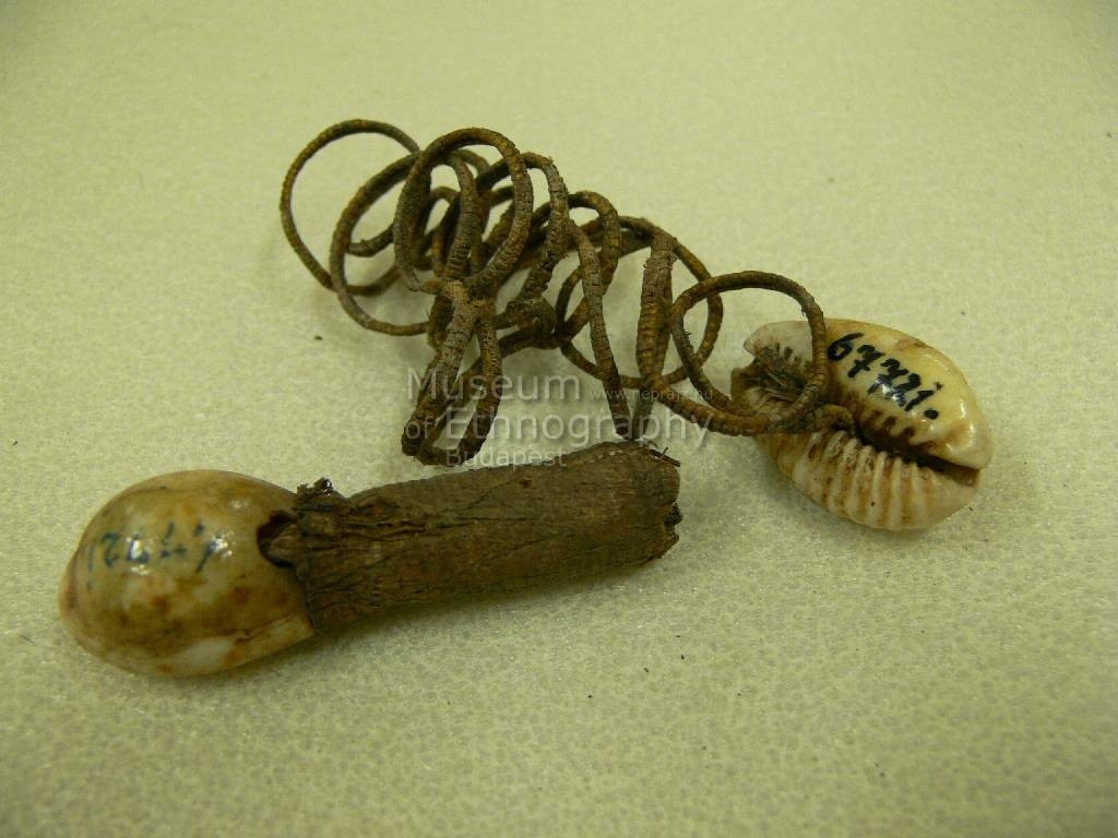 Ovula ovum csigapár széles fonattal összekötve, amelyre kívül fonal van rátekerve. A nyakbaakasztáshoz zsinór van hozzáéerősítve. A tárgy szét van szakadva