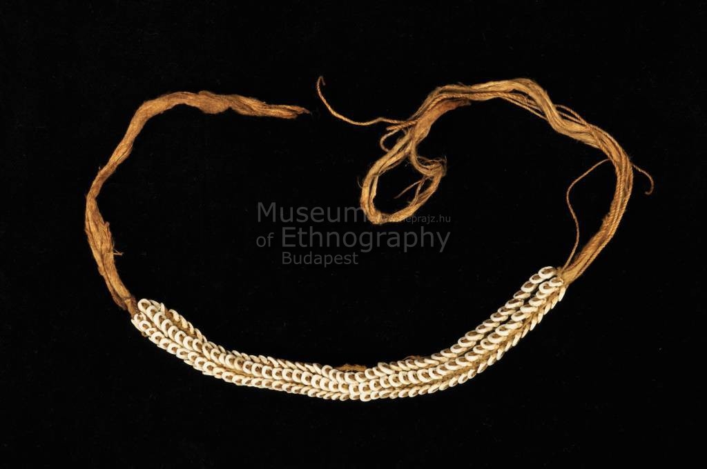 Négy egymás mellé kötött rostzsinór, egyik oldalán rávarrott négy Nassa csigásorral, és két végén díszítetlen kötözővel. Bíró jegyzet 548