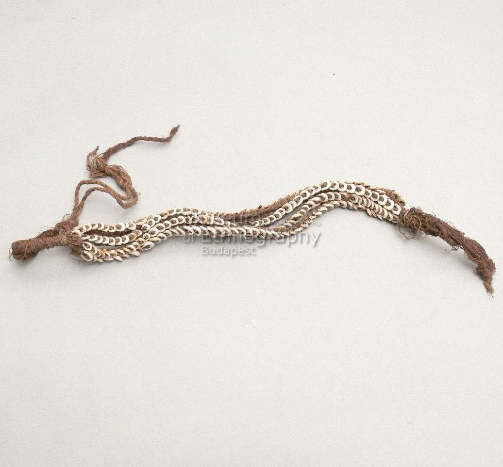 Öt egymás mellé kötött rostzsinór, egyik oldalán rávarrott öt Nassa csigásorral, és két végén díszítetlen kötözővel. Bíró jegyzet 548