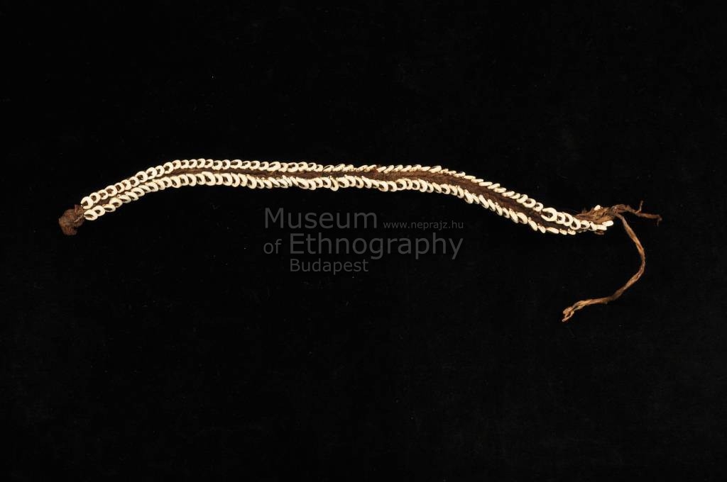 Két egymás mellé kötött rostzsinór, egyik oldalán rávarrott két Nassa csigásorral, és két végén díszítetlen kötözővel. Bíró jegyzet 548