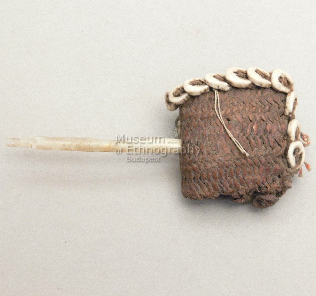 Barna, merev növényrostból fonással készített lapos henger, amely az oldalán áll. Egyik szélén Nassa-csiga sor van rávarrva. Oldalába üreges tollszár van szúrva.