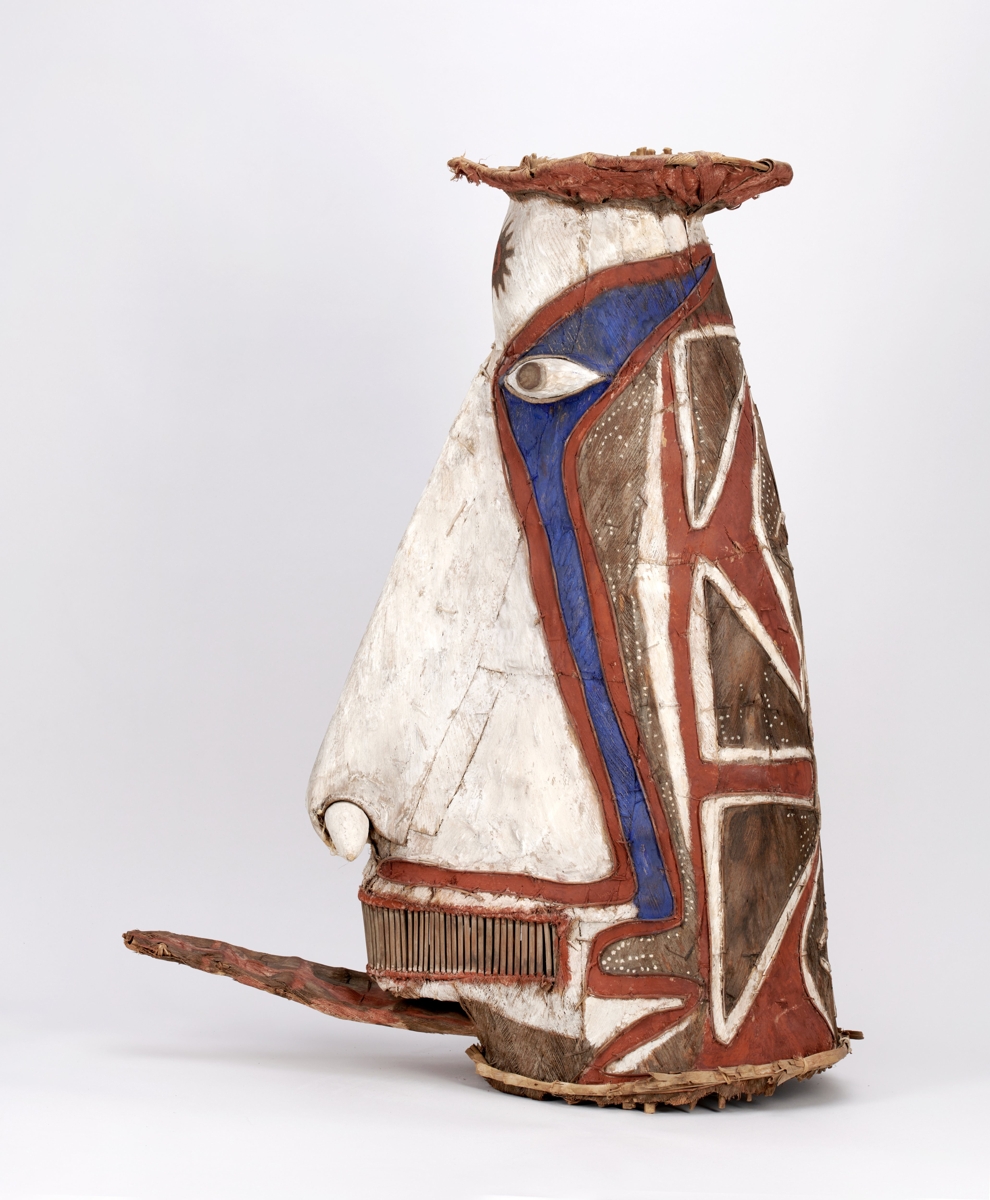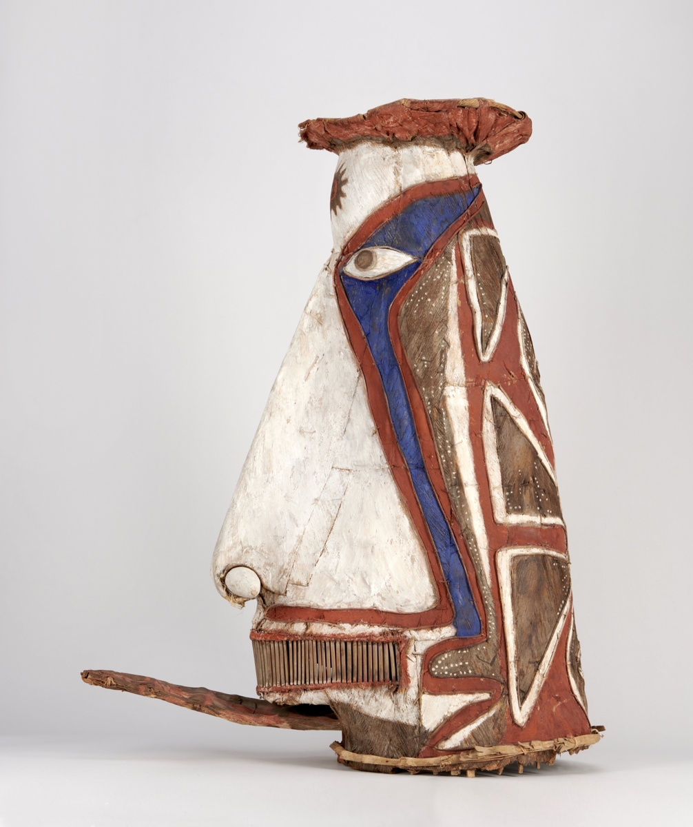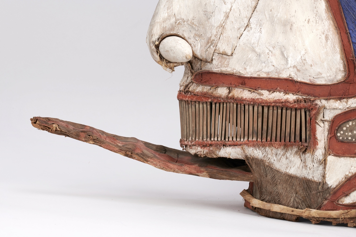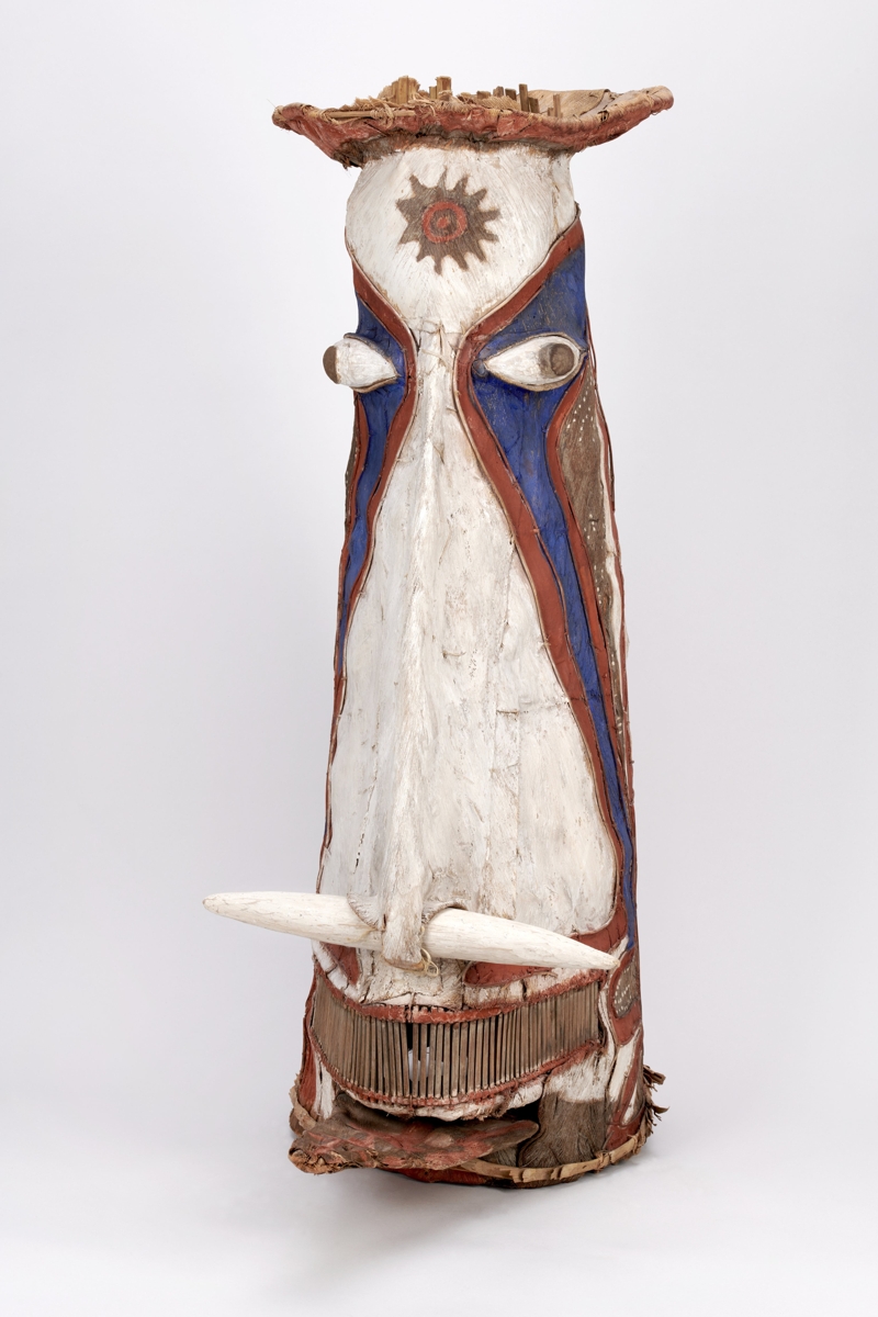 Rotangnád-csíkokból készített, kúpalakú vázra felvarrt és festett faháncs lemezből készült. Elnyújtott emberi arcot ábrázol, az orra aránytalanul hosszú, benne keresztben álló orrdíszt jelző fapálcikával. Vicsorító fogait függőlegesen elhelyezett fapálcikák jelzik. Kinyújtott nyelve hegyes, háromszög alakú fahánccsal bevont váz. Teljes fejrésze rávarrt ágdarabokkal van mezőkre osztva, az ezek által határolt részeken vörös, kék, barnásszürke és nagyobbrészt fehér színnel van befestve. Szeme kidülledőre applikált, szürke pupillákkal. A homlok közepén szürke, közepén vörös, csillag alakú motívum van. Haj és fejviseletét vöröses színű, oldalra álló perem jelzi.
