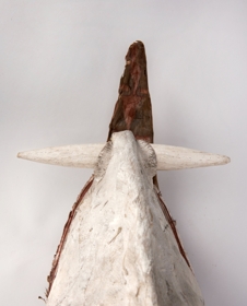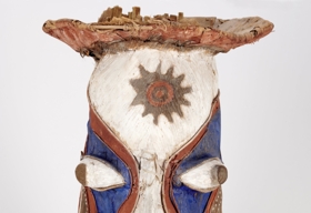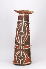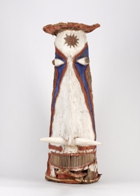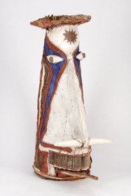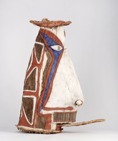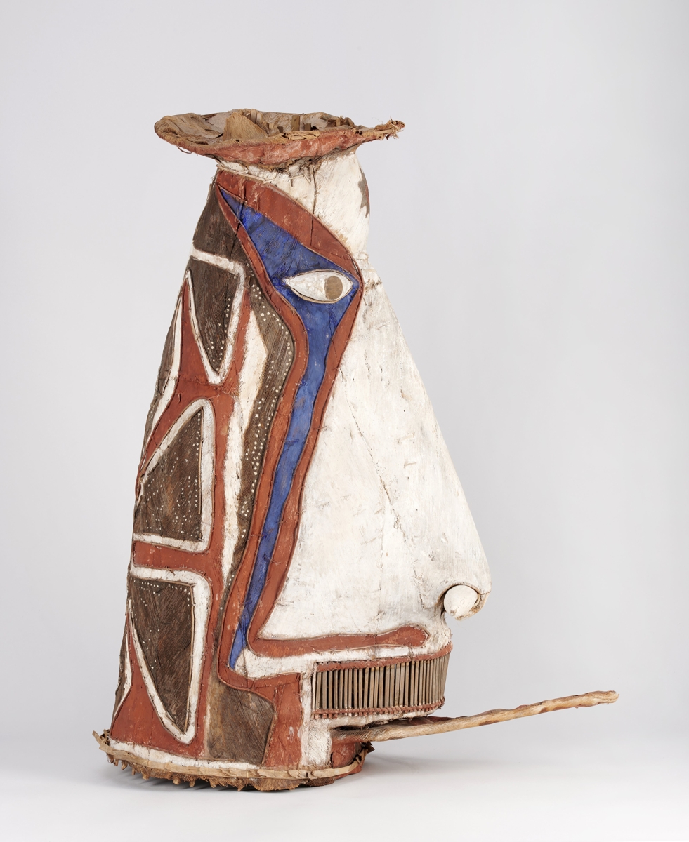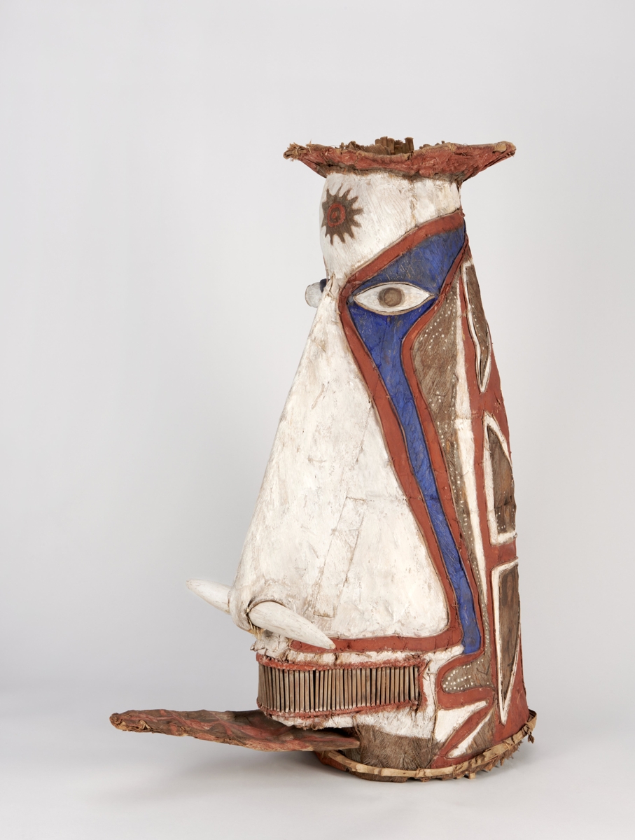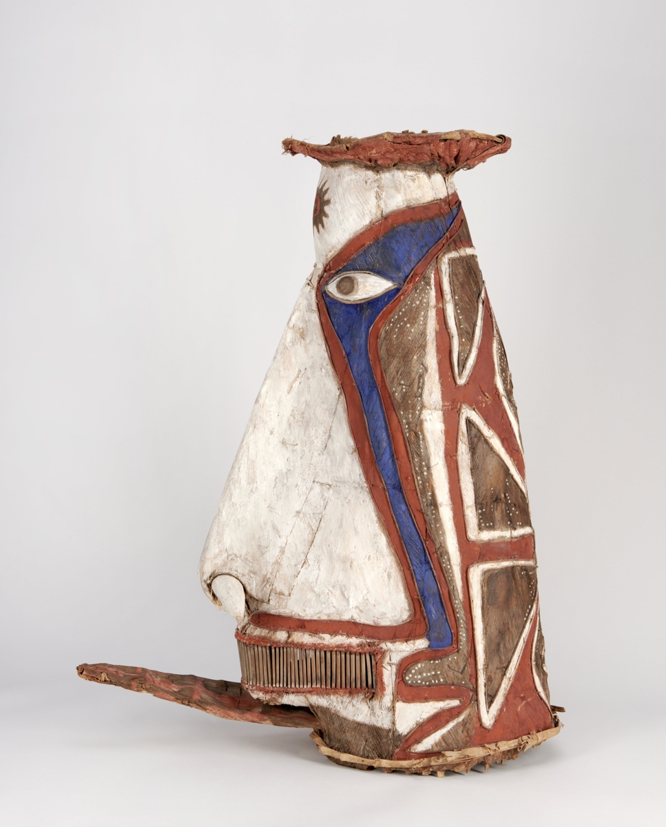 Rotangnád-csíkokból készített, kúpalakú vázra felvarrt és festett faháncs lemezből készült. Elnyújtott emberi arcot ábrázol, az orra aránytalanul hosszú, benne keresztben álló orrdíszt jelző fapálcikával. Vicsorító fogait függőlegesen elhelyezett fapálcikák jelzik. Kinyújtott nyelve hegyes, háromszög alakú fahánccsal bevont váz. Teljes fejrésze rávarrt ágdarabokkal van mezőkre osztva, az ezek által határolt részeken vörös, kék, barnásszürke és nagyobbrészt fehér színnel van befestve. Szeme kidülledőre applikált, szürke pupillákkal. A homlok közepén szürke, közepén vörös, csillag alakú motívum van. Haj és fejviseletét vöröses színű, oldalra álló perem jelzi.