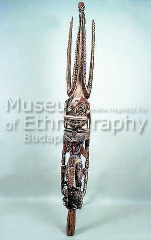 Emberalakos szobor, ún. totok figura, amit malangan házban állítottak fel. A ház és a bennük elhelyezett faragványok szorosan kapcsolódtak a halotti szertartásokhoz. Ennek első szakasza a gyászidőszak végéig tartott, míg második szakaszára, a tulajdonképpeni malangan rítusokra hónapokkal, esetleg évekkel később került sor. E rítusok célja, hogy míg az első szakaszban magát a halottat távolították el, ezúttal a halott lelkétől kívántak megszabadulni, és lehetővé tenni, hogy az bejusson a halottak birodalmába. Az ünnepség középpontjában a különféle szellemeket és az elhunytakat képviselő malangan faragványok bemutatása állt. A puha, könnyen faragható Alstonia villosa fából készített szobor alját képező nyúlványon hal- és madáralak található. A rajtuk álló emberalak hajlított könyökéhez madarak kapcsolódnak. Kezeiben a mell előtt madarat tart. Megnyújtott, kúpalakú fejdíszét négy áttört nyúlvány keretezi, melyek közül a homlok fölötti madárfejben végződik. E szobortípus, mely Új-Írország északi része mellett Új-Hannoveren és a Tabar-szigeteken fordul elő, jellemzői az áttört megmunkálás, a faragott állat attribútumok (madár, repülőhal, kígyó), a test mellett vagy a fejen oldalt elhelyezett díszítő lécek, valamint az egész felületet borító festett (fekete, fehér, vörös, kék) díszítőmotívumok.