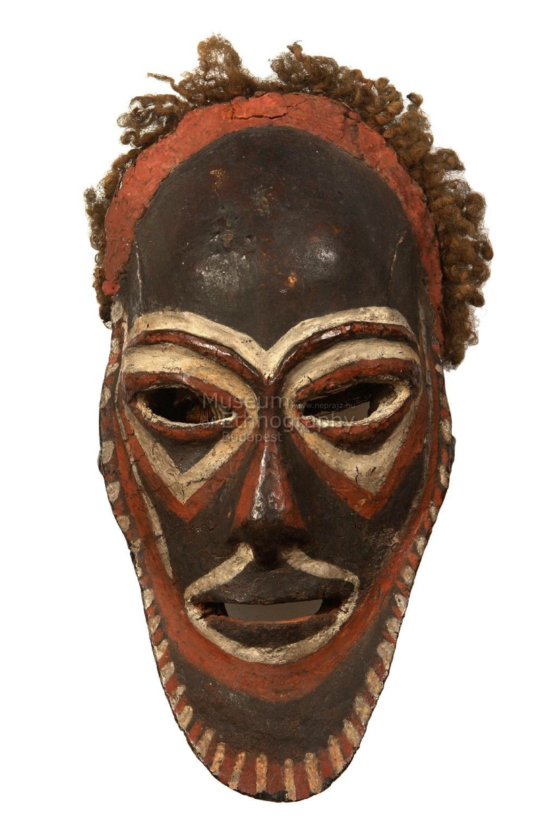 Emberi koponyából és állkapocsból készített maszk. Elülső oldalán anyaggal modellált, álla lekerekített, orra és szemöldökei kiemelkedőek. Az arcrész alapszíne sötétbarna, a díszítőmotívumok, melyek az arcfestést utánozzák, vörös és fehér színűek. A maszk homlokát fakószürke göndör haj keretezi, mely vöröses színű anyag segítségével van felerősítve. Hátsó részén a maszk két peremét farudacska köti össze, melyre rostkötél van kötve.