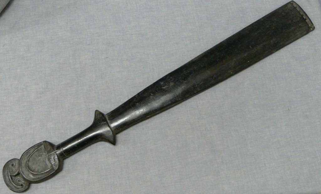 Keményfából faragott, feketés színű, lapos, kardszerű tárgy. Forgóján áttört, stilizált madáralakokkal és vésett, hullámvonalas motívumokkal van díszítve. Fehér inkrusztálás nyomaival. Alul vésett, szalagszerű díszítés