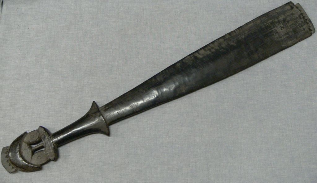 Kemény faanyagból faragott, feketés színű, lapos, kardszerű tárgy, alsó végén lyuksorral. Markolatának végén elnagyolt, áttört díszítéssel. Egyik alsó sarka lepattant