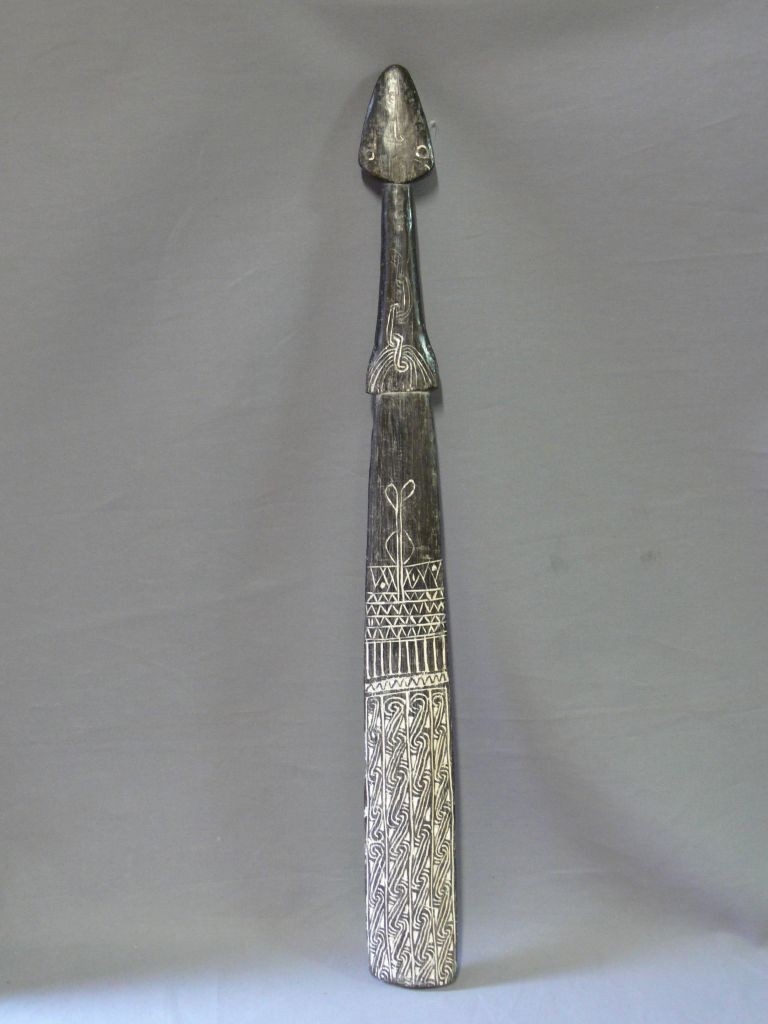 Feketés színű, keményfából készült, kard alakú tárgy. A penge egyik oldalát massim mintájú vésés fedi, mely fölött geometrikus minta van. Másik oldalát teljes egészében geometrikus minta díszíti, amely kissé elnagyolt. A fogó egyik oldalon stilizált állatfejet (kígyó? krokodil?) ábrázol. A vésetek fehérrel vannak inkrusztálva.