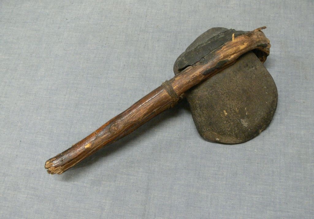 Hántolatlan természetes faág összehajlítva, közé erősítve hánccsal és gyantával egy éles szélű kő.