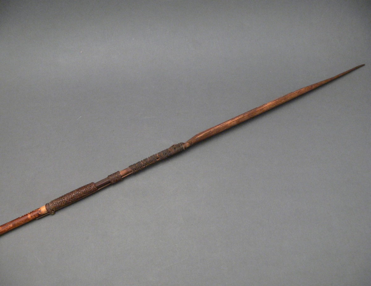 rtifact made of three parts: a hard wood reinforcement is fitted into the incision at the end of the reed hafting. A bamboo point is attached to this hardwood bit. All fittings have been reinforced with fiber twine.
