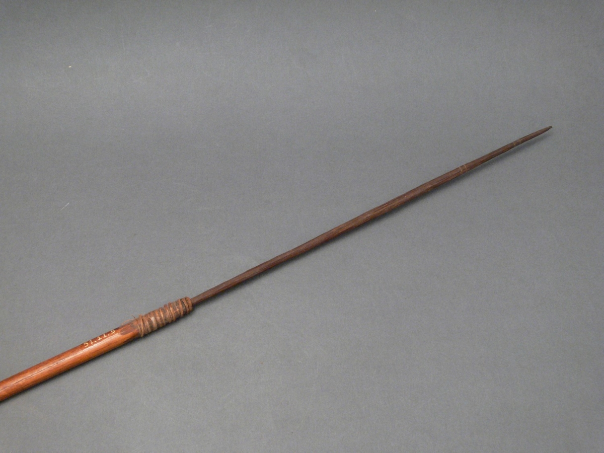 Thirty-eight specimens composed of two parts. The shafts are made from reed while the points are carved out of reddish brown or blackish hard wood with incised barbs. The hafted points were fastened using woven inner tree bark. They are decorated by pairs of incisions around the upper part of the hafting and the tip of the point respectively