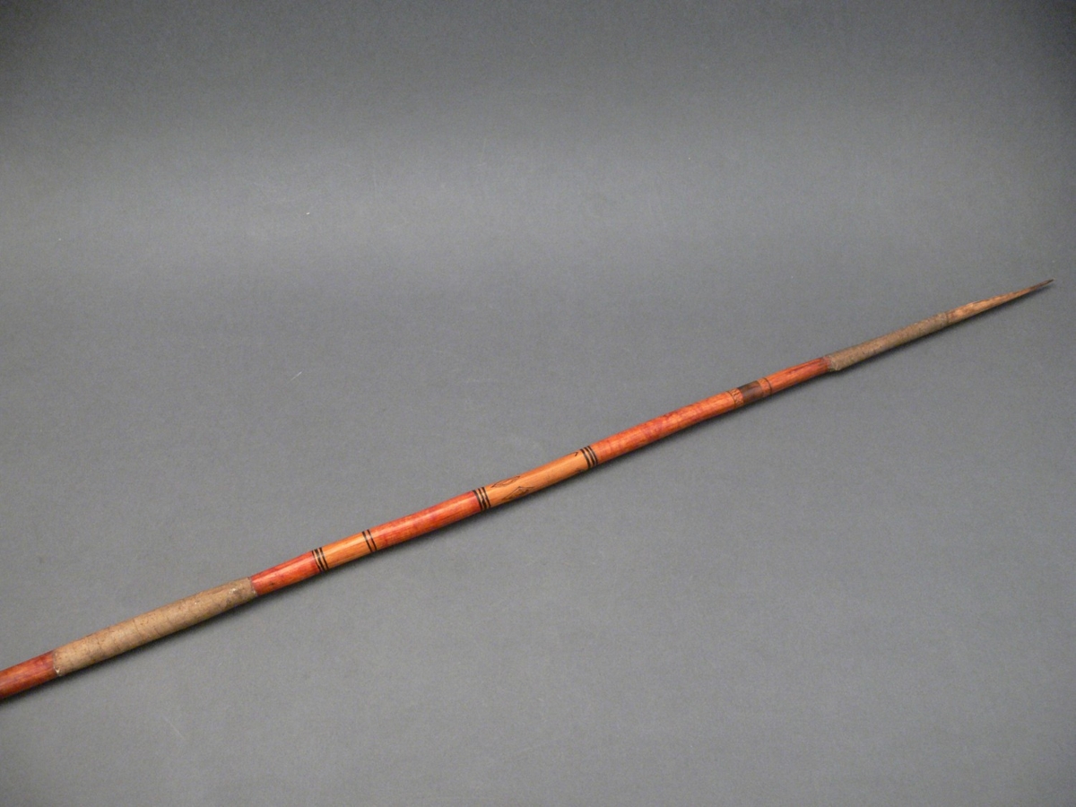 Háromrészes nyílvessző. A bambuszból készült szárba növényi rosttal rögzítették a keményfából faragott középrészt. A simára polírozott középső részt sárgára és vörösre festették, ezeket a részeket dupla, illetve hármas fekete festett gyűrűk választják el. A középrészhez ugyancsak növényi rostból készült zsineggel erősítették a csontból készült hegyet.