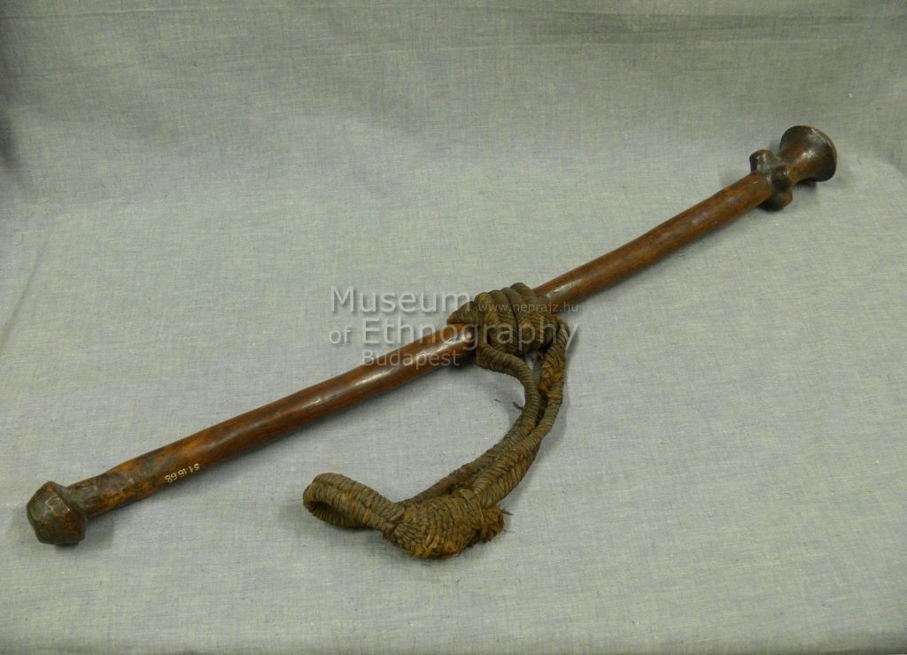 Világosbarna keményfából készült, enyhén görbe vonalú, szabálytalan, egyenetlen keresztmetszetű buzogány. A markolatgomb csonkakúp alakú. A markolatgomb oldalán ütésnyomok láthatók (díszítés?). A 'kupolás' vég alatt 70 mm-re, négy darab 21–21,5 mm magas, 35,5 × 24,5 mm méretű 'bütyök' található, a nyél kerületén körben arányosan elosztva. A nyélen növényi szálból készült, többszörösen áttekert fonat, amelynek a vége csomós.