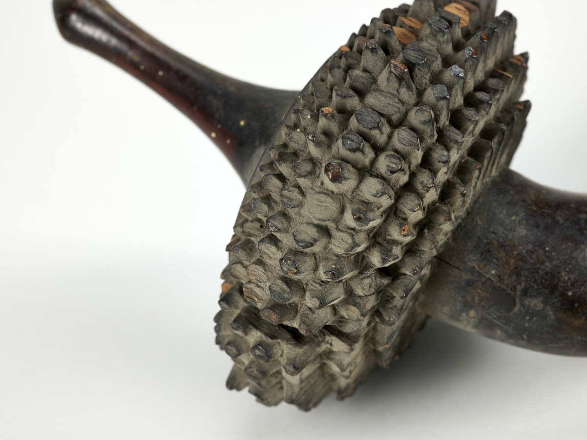 Buzogányszerű végük a csavarpálma (pandanus) termését jelezheti, de hivatkoznak rá ananászfejű ütőként is, vagy a csontváz fejeként is.