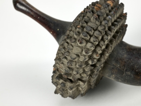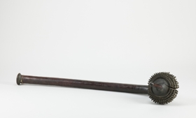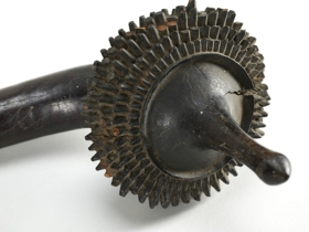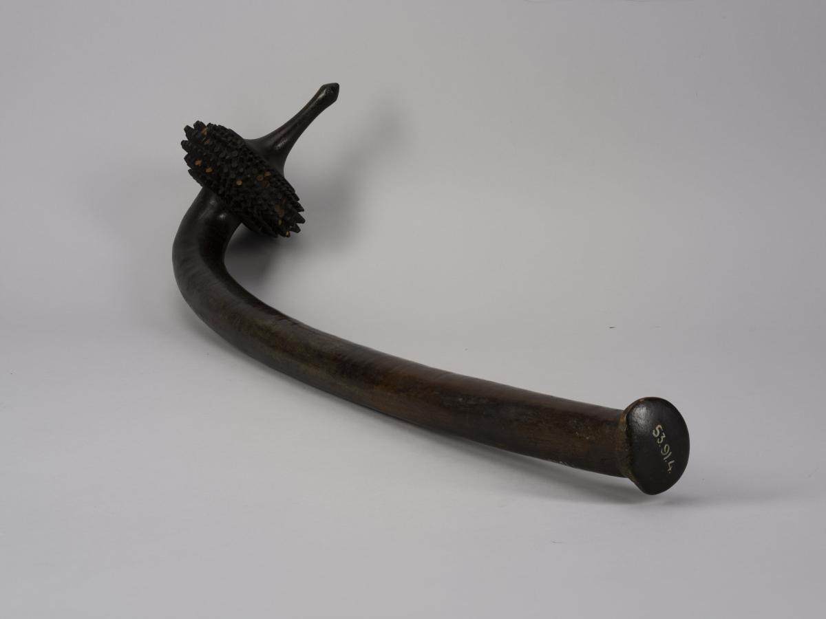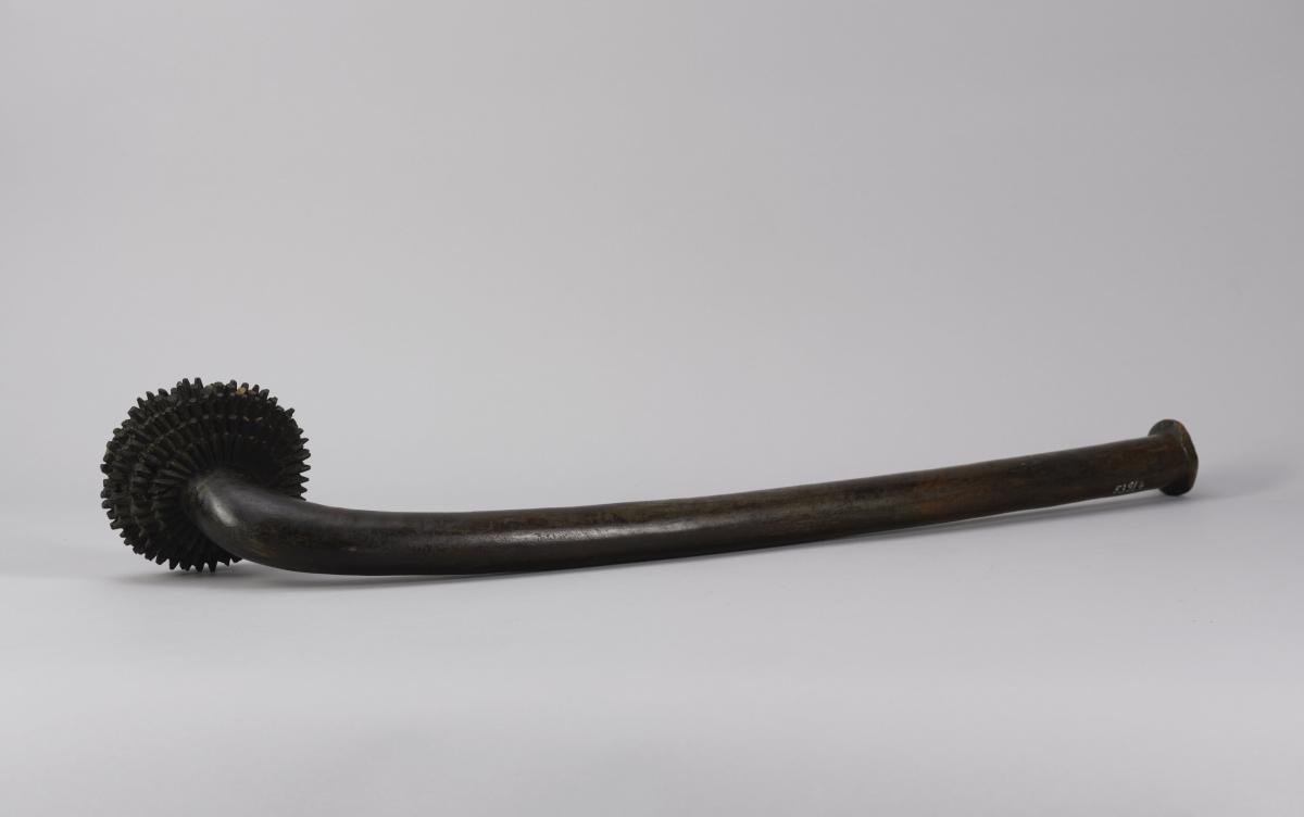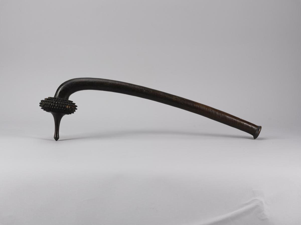 Keményfából faragott, feketés színű, hengeres nyelű tárgy, hajlott ütőrészén kúpos bevágásokkal ellátott korongszerűen kiképzett faragással. Fogórésze mély bevágásokkal van díszítve.