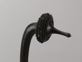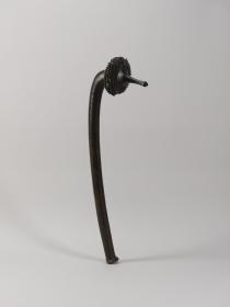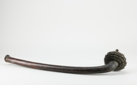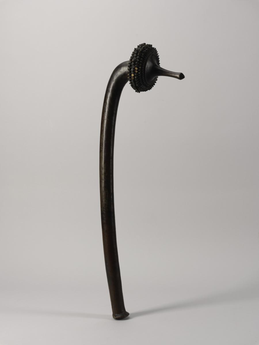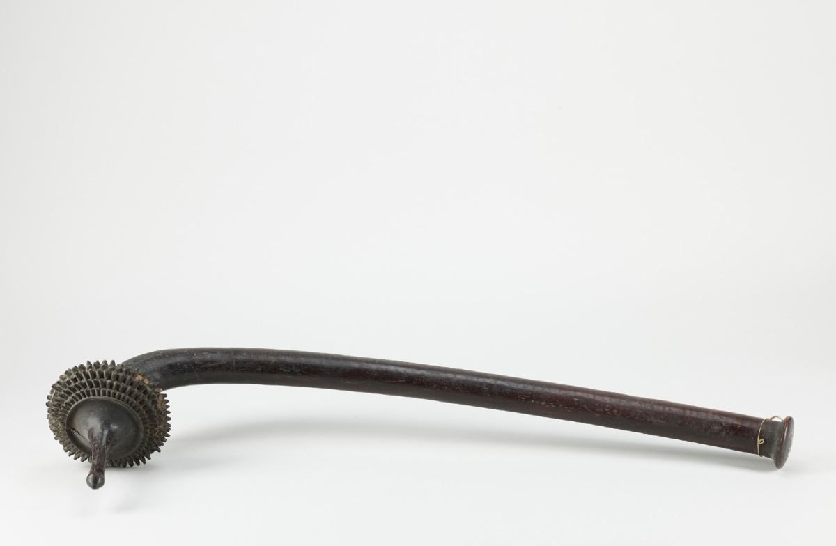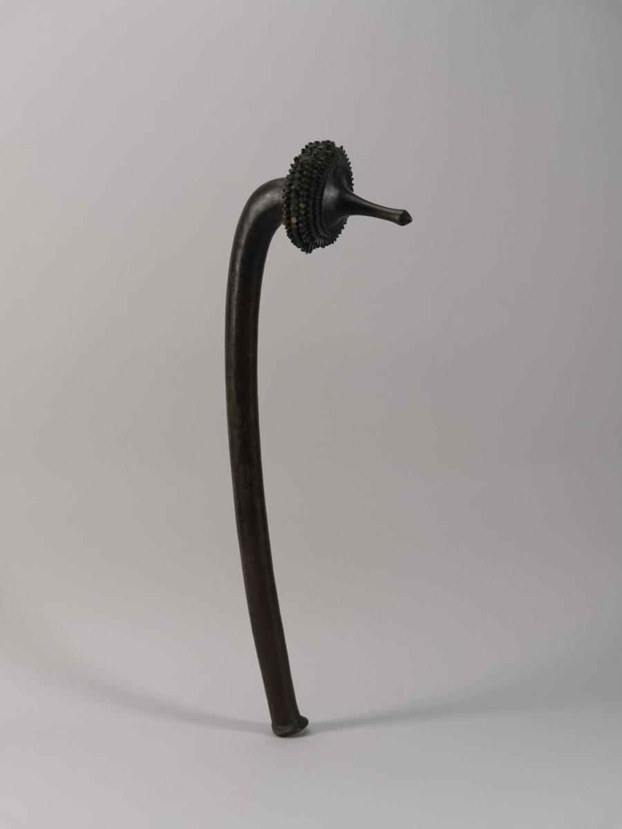 Keményfából faragott, feketés színű, hengeres nyelű tárgy, hajlott ütőrészén kúpos bevágásokkal ellátott korongszerűen kiképzett faragással. Fogórésze mély bevágásokkal van díszítve.