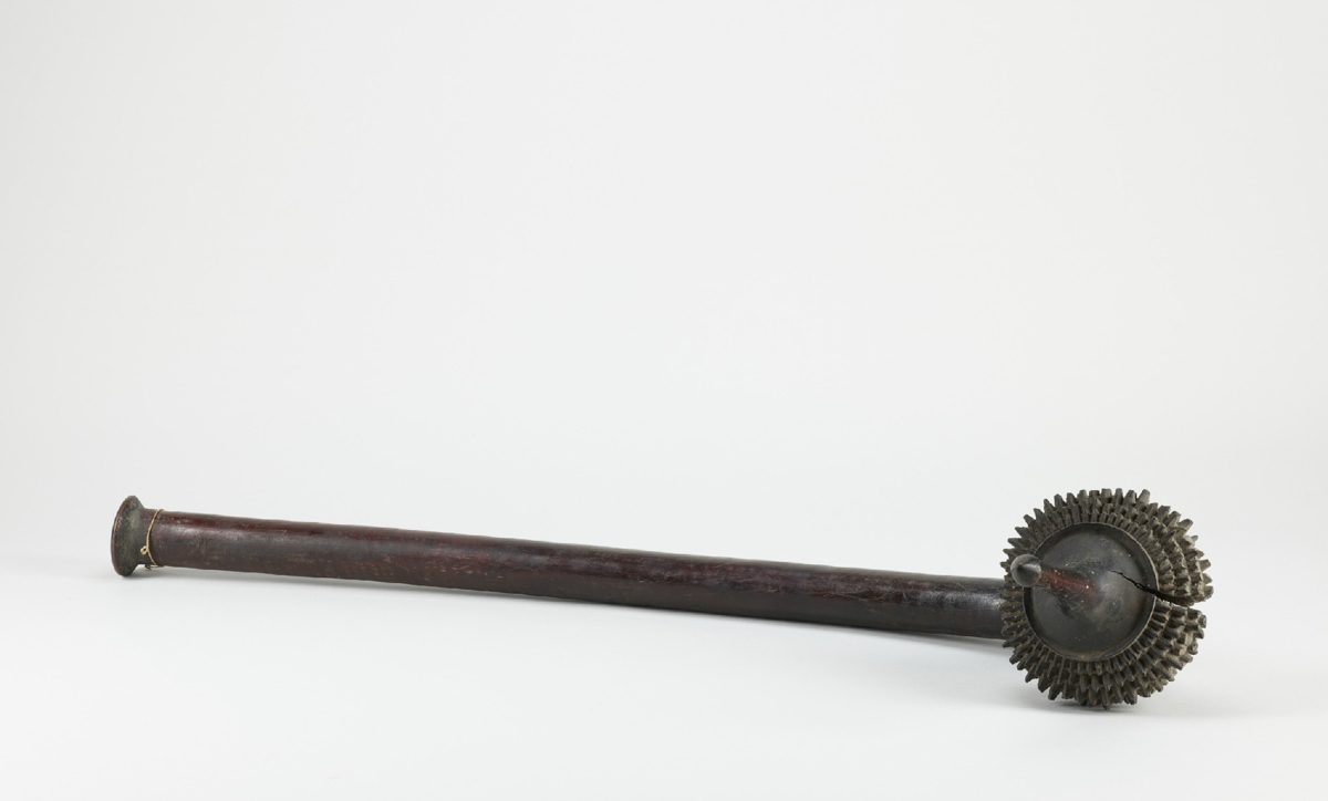 Sötétbarna keményfából készült, erősen ívelt vonalú, hengeres nyelű buzogány. Hosszúsága 780 mm, szélessége 250 mm, súlya 1,482 kg. A markolati rész végén egy ovális keresztmetszetű (48,1 × 54,6 mm), 10,5 mm hosszú (magas) markolatgomb van. A nyél átmérője a markolatgombnál 37,5 mm, a fej ívelt nyaka előtt a keresztmetszet 42,8 × 38,4 mm. A fej 51,6 mm magas, felülnézetben megközelítőleg kör keresztmetszetű, átmérője 130–135 mm. Hét egymás fölötti körkörös sávban, sűrűn, csonkakúp alakú 'tüskék' helyezkednek el. A végnyúlvány ívelten kapcsolódik a fej tetejéhez, 100 mm hosszú, vége tompított csúcsú kúp, átmérője 18 mm. PA