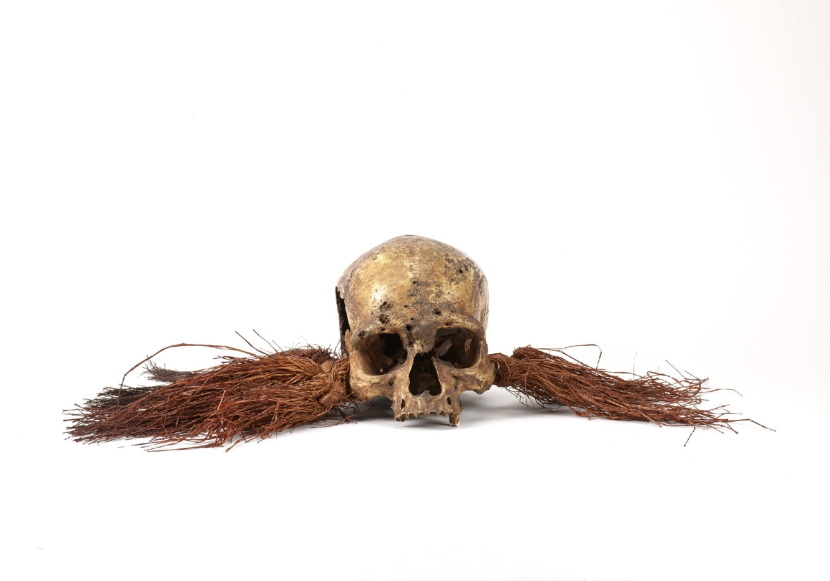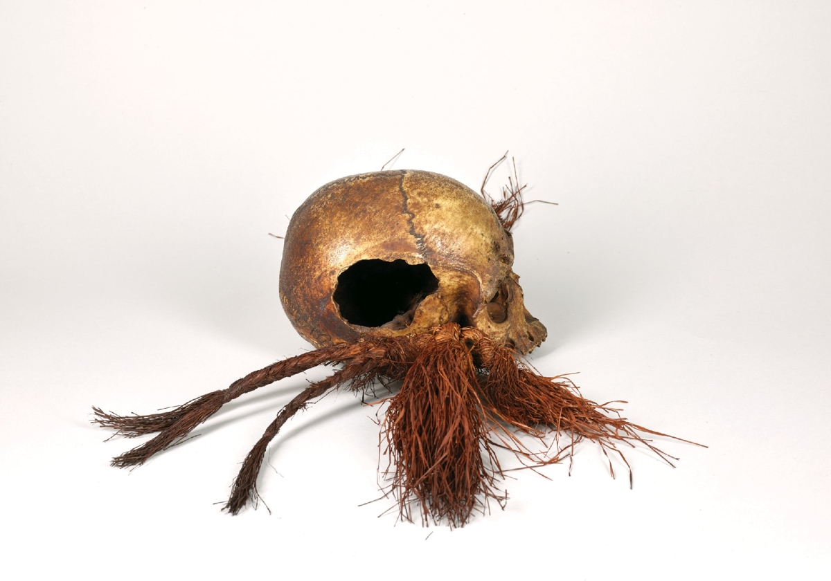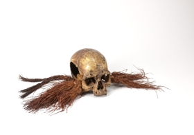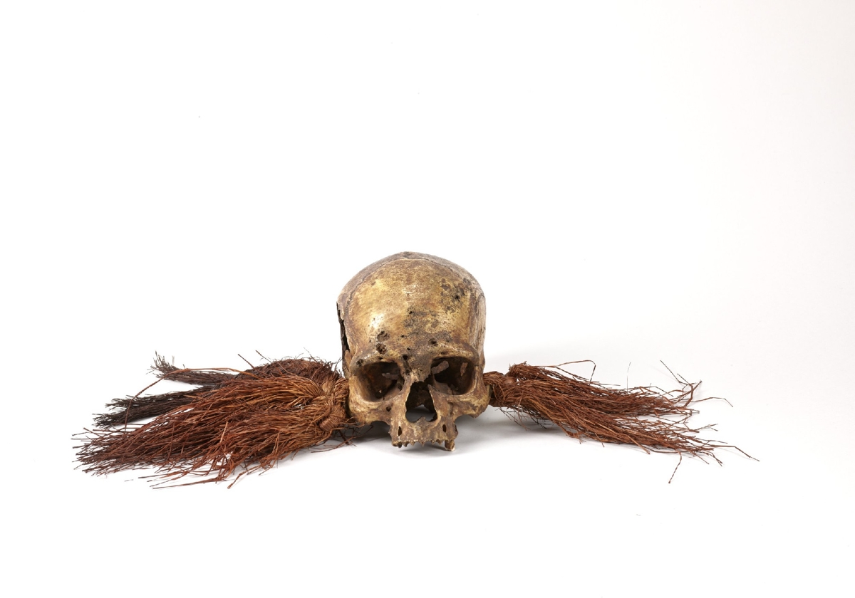 Sárgásbarnás színű emberi koponya, állkapocs nélkül, bal oldalt nagy nyílással. Járomcsontjaiba vöröses színű fűbojtok vannak kötve.