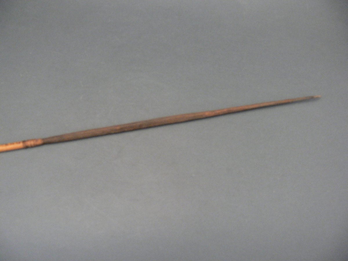 Kétrészes nyílvessző. A nádból metszett szárba növényi rostfonatokkal rögzítették a keményfából faragott, négyzetes keresztmetszetű hegyet.