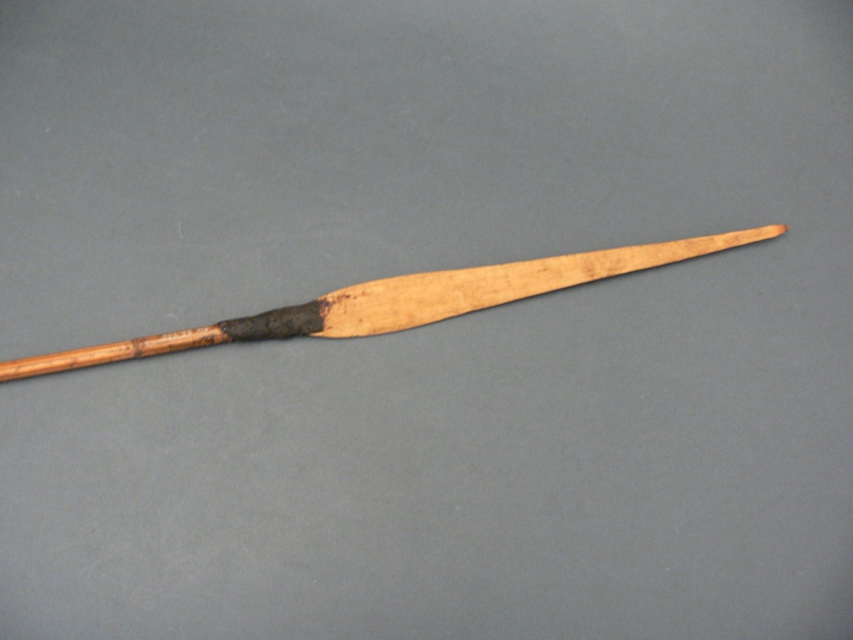 Kétrészes nyílvessző. A bambuszból készült szárba ragasztóanyaggal borított növényi rostzsineggel rögzítették az ugyancsak bambuszból metszett, levélalakú hegyet.