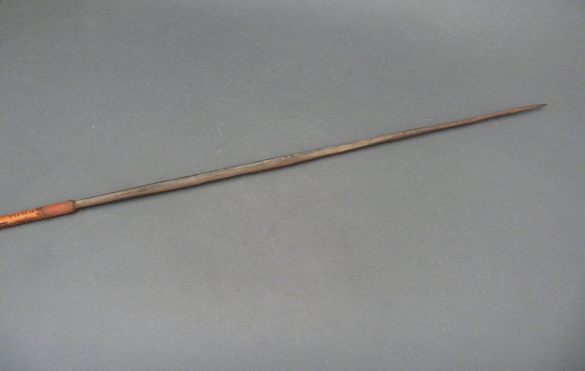 Kétrészes nyílvessző. A bambuszból metszett szárba növényi rostfonattal rögzítették a keményfából faragott, négyzetes keresztmetszetű hegyet. A rostfonat környékén vörös festés nyomai láthatók.