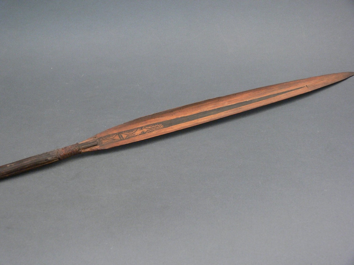 Háromrészes nyílvessző. A bambuszból metszett szárba ragasztóanyaggal megerősített növényi rostzsineggel rögzítették a fából faragott középrészt, amihez hasonló technikával erősítették a levélalakú bambuszhegyet. Ennek belsejébe geometrikus mintát karcoltak.
