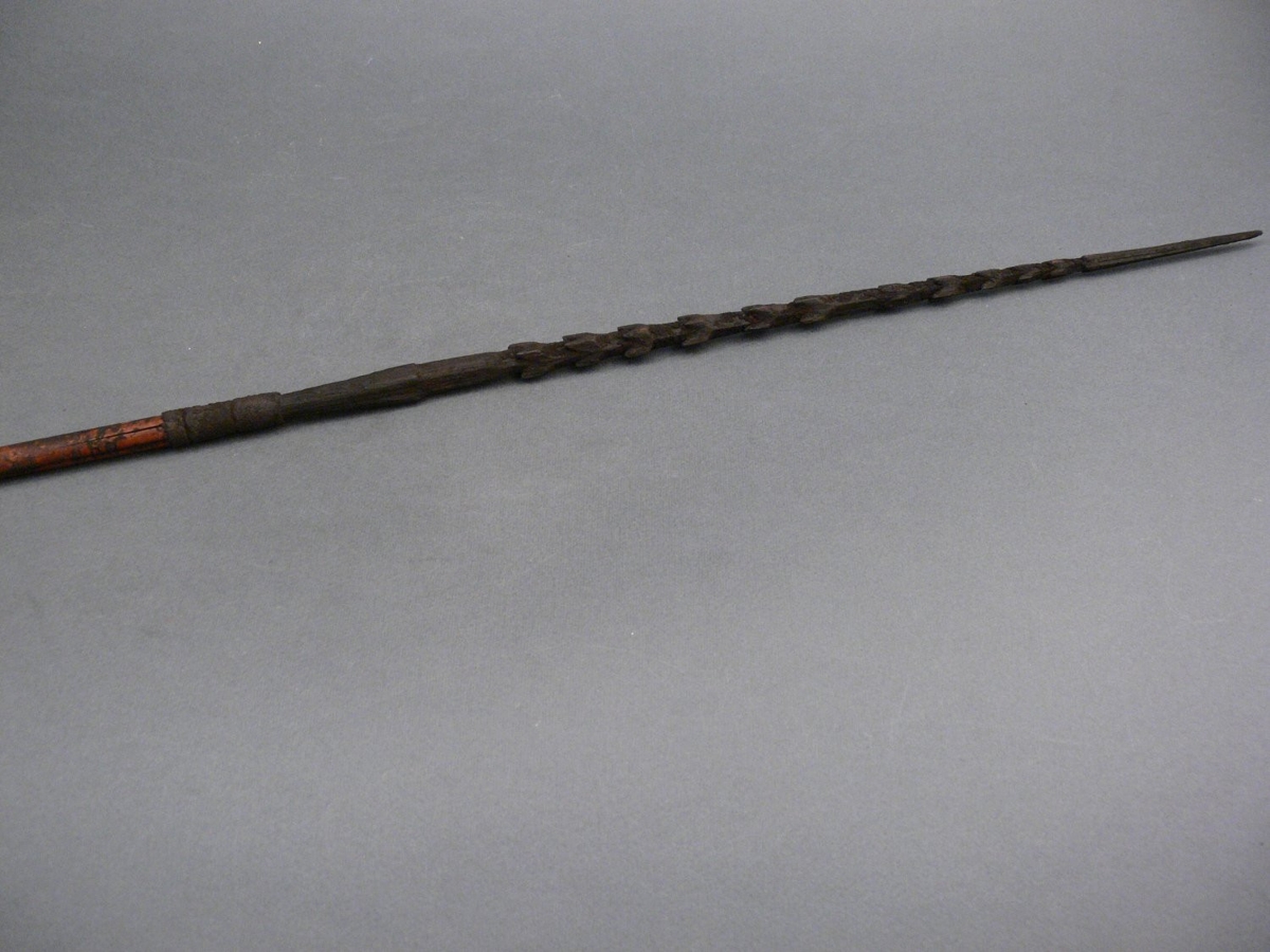 Kétrészes nyílvessző. A bambuszból metszett szárba növényi rostfonattal rögzítették a fából faragott, négyzetes keresztmetszetű hegyet, melynek éleibe szakákat faragtak.